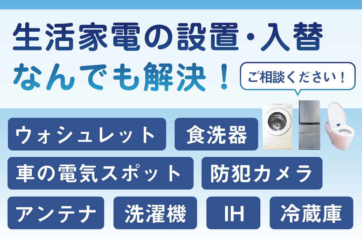 ウォシュレット・食洗器・冷蔵庫・車の電気スポット・洗濯機・IHなどご自宅で活躍する生活家電の設置や入替をサポートいたします!